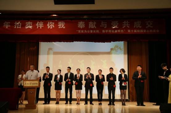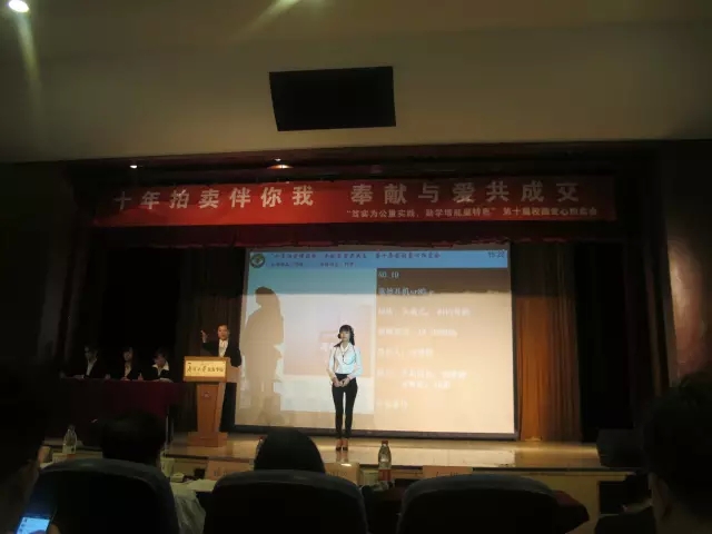 拍賣會現(xiàn)場 愛心拍賣會上,11位來自拍賣專業(yè)的“拍賣師”們,一一登臺上場主拍。29件拍品大部分來自同學(xué)們的捐贈,也不乏有老師們和校友們的愛心奉獻(xiàn),其中來自中拍協(xié)張延華會長捐贈的一對清代粉彩小碟最受矚目,拍品背后由張會長的親筆簽名。這件拍品也獲得了全場拍賣之星,拍得1萬元人民幣。整場拍賣會共上拍39件拍賣,拍出3.46萬元的高價。拍賣所得全部捐贈給湖南省2所貧困小學(xué)。